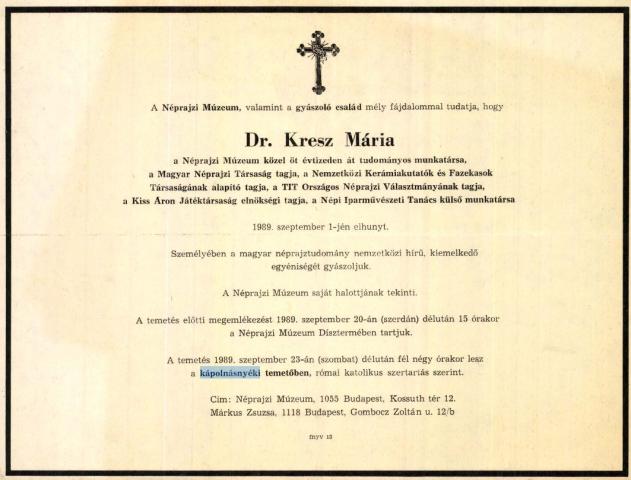 A nyéki temetőben, a Luczenbacher kripta szomszédságában van egy érdekes, borostyánnal befutott sír. A sűrű, zöld levelek alatt egy kicsi márványtábla tudatja a kíváncsiskodóval, hogy talán egy zongoraművésznőnek és édesanyjának záródott itt le az útja. A temetői nyilvántartás nem említi a két nevet, a dokumentumok szerint dr. Kresz Mária néprajzkutató védett sírja ez.