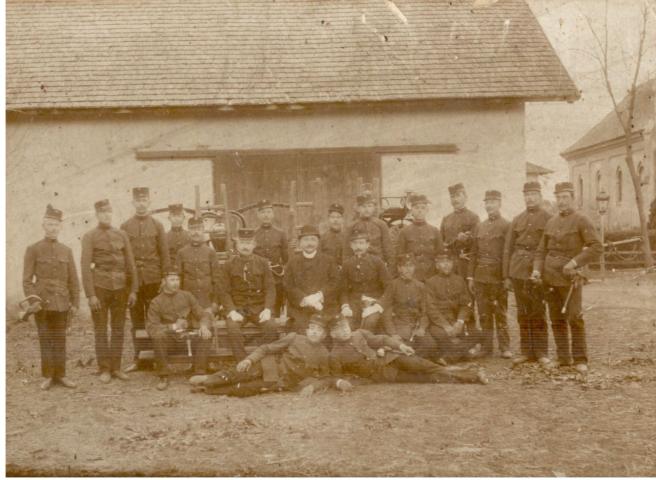 A kép a XIX. század utolsó harmadában készülhetett, annak az épületnek az udvarán, amely a gazdakörnek és az óvodának is otthont adott. (Nem egy időben...) A tűzoltó szertár még a századforduló előtt átköltözött a Deák Ferenc utcába, ahol most az öreg villanyszerelő Borbély háza áll. Onnét költözött tovább a főutcára, az orvosi rendelő és szolgálati lakás mellé. Jobbról jól látható a háttérben a református templom, illetve az akkoriban volt gázlámpák.